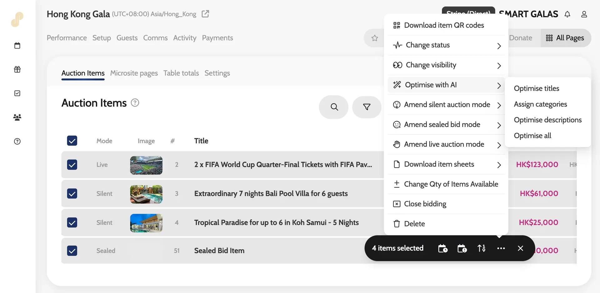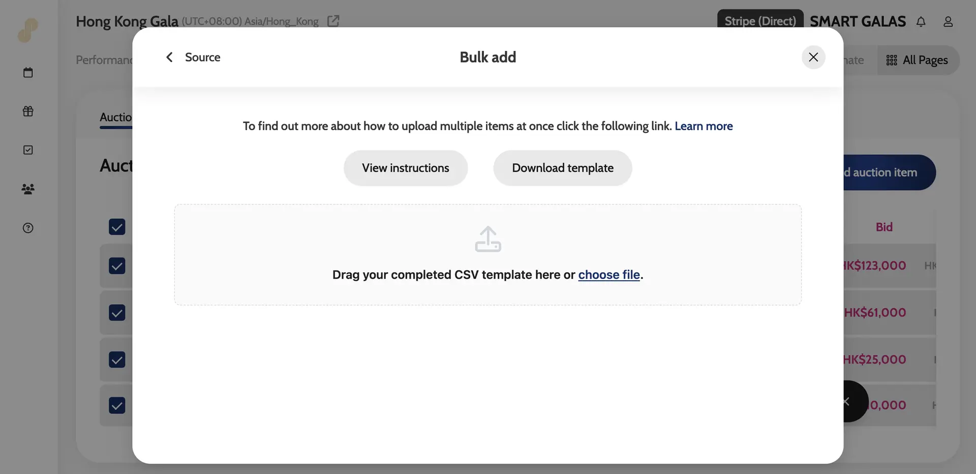 • Go to All Pages > All Auction Items > Auction Items > Add auction item > Bulk add