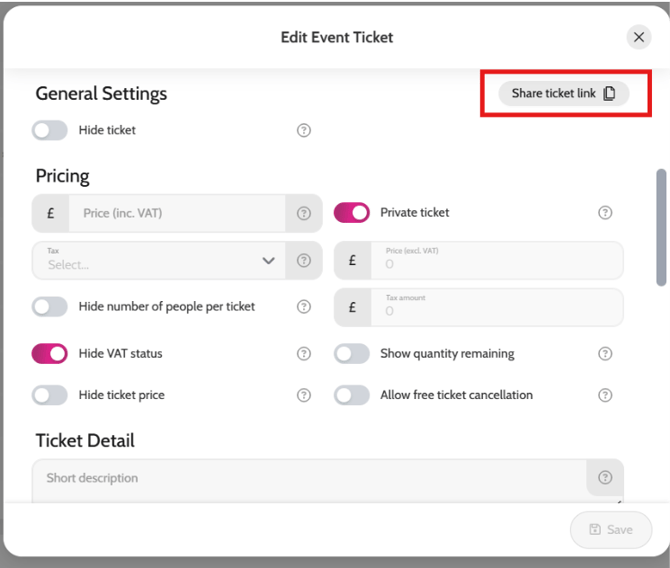 - A “Ticket Share Link” button will appear at the top right – click on it to copy the link and then share with your guest(s)