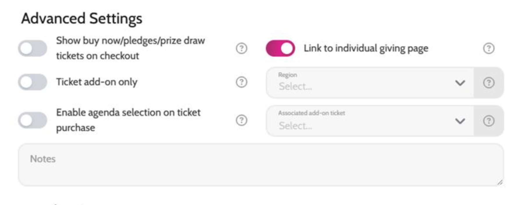 - IMPORTANT: make sure when creating the ticket that you go to "Advanced settings" and turn on "Link to Individual Giving Page"